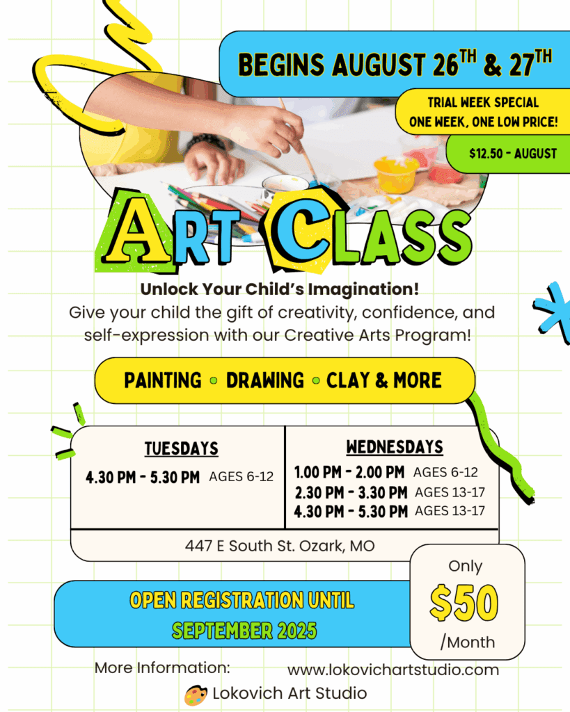 This course is designed to help students ages 6–12 develop foundational art skills while building confidence in using a variety of materials, including paint, drawing, fibers, and clay. The cost is $50 per month, which includes four one-hour class sessions and all necessary materials. Class size is limited to 20 students to ensure individual attention and a supportive learning environment.